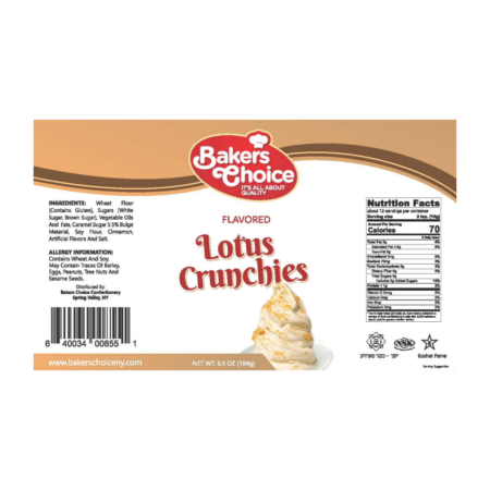 Description: Top off milkshakes and ice cream sundaes with Bakers Choice Lotus Crunch! They are great for adding to sweet treats. Simply sprinkle it onto ice cream cakes or gourmet doughnuts, or mix it into a cheesecake recipe for a signature dessert. Our Lotus Crunch could also be used as a layer between your ice cream cake, mouse cup, or cheese cake. Keep it on hand in your kitchen or at dessert buffet stations to add a familiar, delectable Lotus cookie taste and crunch to any treat.