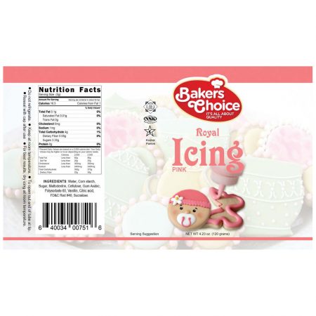 Description: Make your cake decorations more dynamic with Bakers Choice ready-to-use Pink Royal Icing. Great for dots, messages, designs and decorations. Try it on cookies, cupcakes, ice cream and more! To open cut tube at tip. Reseal with cap after use. For best results, dry icing at room temperature. Keep at room temperature. Do not refrigerate.