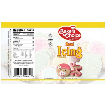 Description: Make your cake decorations more dynamic with Bakers Choice ready-to-use Yellow Royal Icing. Great for dots, messages, designs and decorations. Try it on cookies, cupcakes, ice cream and more! To open cut tube at tip. Reseal with cap after use. For best results, dry icing at room temperature. Keep at room temperature. Do not refrigerate.